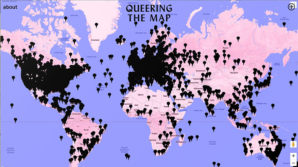Queering The Map est un projet numérique de cartographie alternative (digital counter-mapping) généré par la communauté, qui vise à archiver des moments d'existence et de résistance queer en relation avec l'espace physique. Qu'il s'agisse d'actions directes ou de conversations quant à l’usage des pronoms de genre, du sentiment d'isolement ou de moments d'amour ravissant, Queering the Map fonctionne comme une archive vivante des sentiments queer. En traçant l'expérience queer dans toutes ses permutations, Queering the Map vise à prolonger la persistance de ces potentialités dans l'espace physique en les archivant dans l'espace virtuel. En rendant lisible des moments queer éphémères, le projet ouvre la voie à de nouveaux modes de connexion intersubjective à travers les divisions spatio-temporelles. Au moment de la rédaction de cette description, Queering The Map héberge plus de 45 000 témoignages queer en provenance du monde entier.