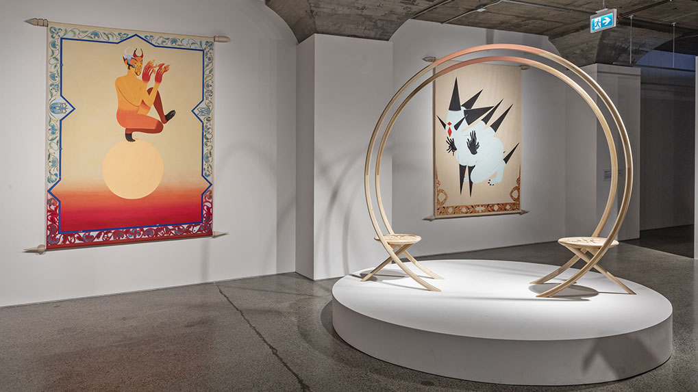 Formes s'inspirant des diagrammes scientifiques et de la science-fiction pour élargir les notions d'existence au pouvoir. Les mythologies autoréférentielles et autogénératrices derrière les êtres représentés sur les bannières peuvent être discutées comme des représentantes alchimiques se déplaçant entre les états de la matière, parallèlement à notre plan d'existence. Elles servent à nous ouvrir l'idée qu'il est acceptable de vivre et d'être efficace ou accepté, ou de prospérer ou d'échouer. Les œuvres s'inscrivent dans la continuité de la série Positive Forms, combinant la dynamique de la danse à l'esthétique formelle de la science-fiction pour offrir un nouveau spectacle de pouvoir inclusif à l'avenir de la diaspora.